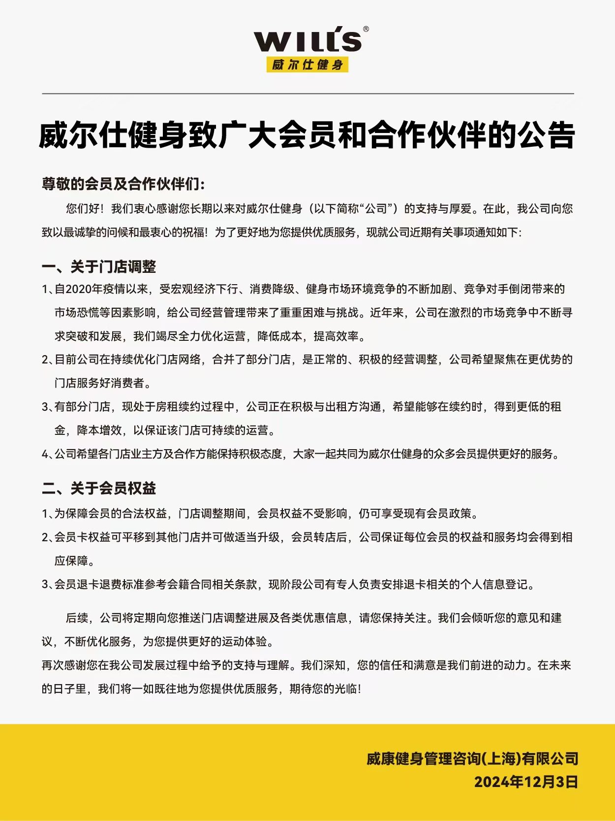 近期,不少破钞者在外交平台反应,威尔仕健身多家门店出现门店团结、暂停生意等情况,激发眷注。威尔仕在公告中暗示,自2020年疫情以来,受宏不雅经济下行、破钞左迁、健身市集环境竞争的不时加重、竞争敌手倒闭带来的市集心焦等身分影响,给公司主义束缚带来了重重贫瘠与挑战。频年来,公司在热烈的市集竞争中不时寻求打破和发展,逸以待劳优化运营,镌汰本钱,升迁后果。