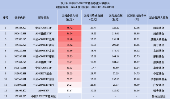 追随居品数目加多、范畴增长,中证A500ETF捏续成为市集的焦点。从资金流入来看,Wind数据涌现,甘休11月18日,广发中证A500ETF龙头、中证A500ETF南边、中原A500ETF基金净流入额居前,永诀为24.27亿元、11.94亿元、11.72亿元。